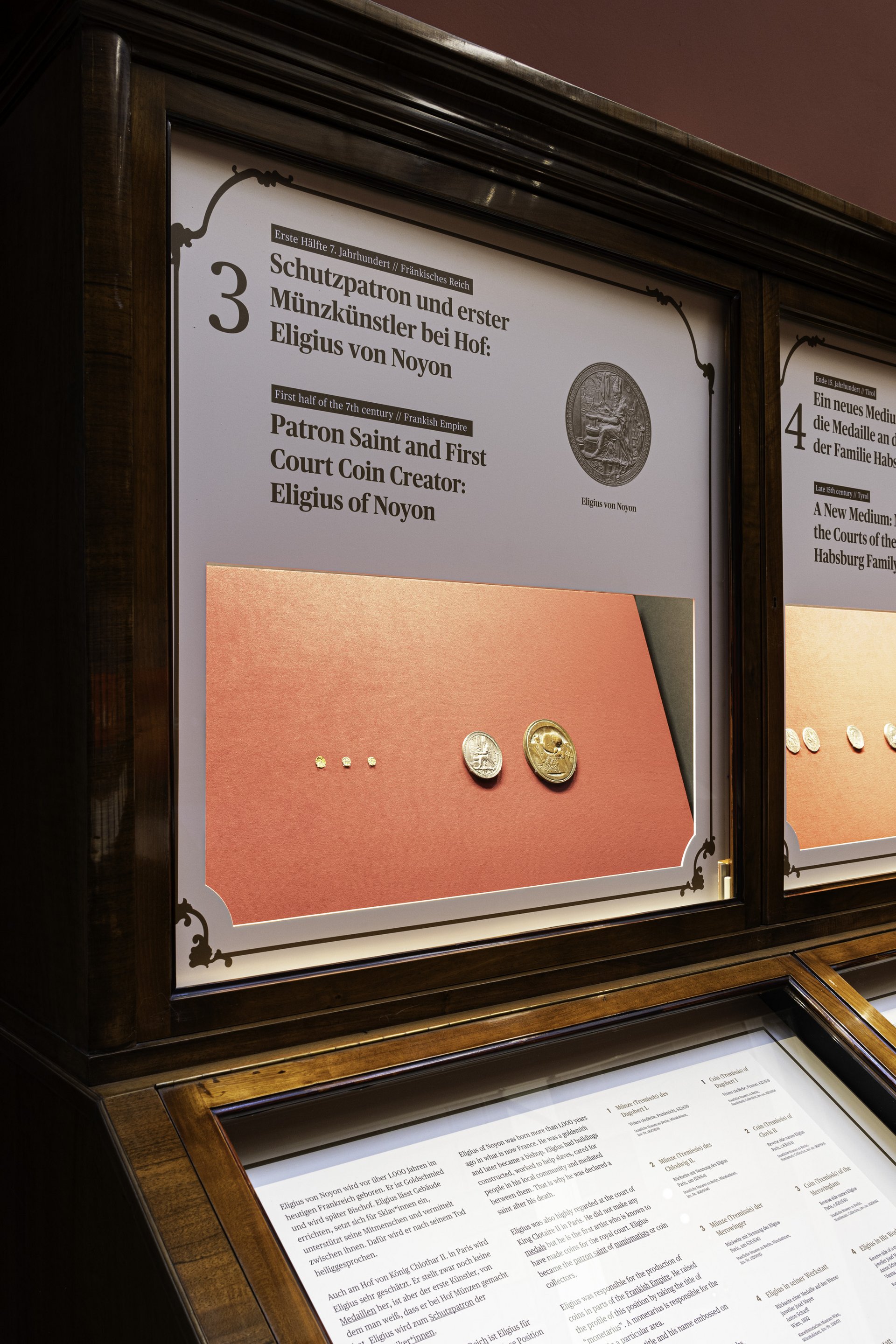 70 Medaillen aus 400 Jahren stehen Werken aus Bildhauerei und Malerei gegenüber. Die Ausstellung Prunk & Prägung folgt Künstlern, die oft in mehreren Kunstformen arbeiten. Sie fertigen Medaillen an, sind aber auch Architekten, Maler, Bildhauer oder Goldschmiede. Die Ausstellung zeigt Medaillen zusammen mit anderen Werken derselben Künstler. Über die Jahrhunderte verändert sich die Arbeitsweise: In der Renaissance und im Barock machen die Künstler neben Medaillen auch Skulpturen, Gemälde oder Ahnliches. In späterer Zeit spezialisieren sie sich ganz auf Medaillen.