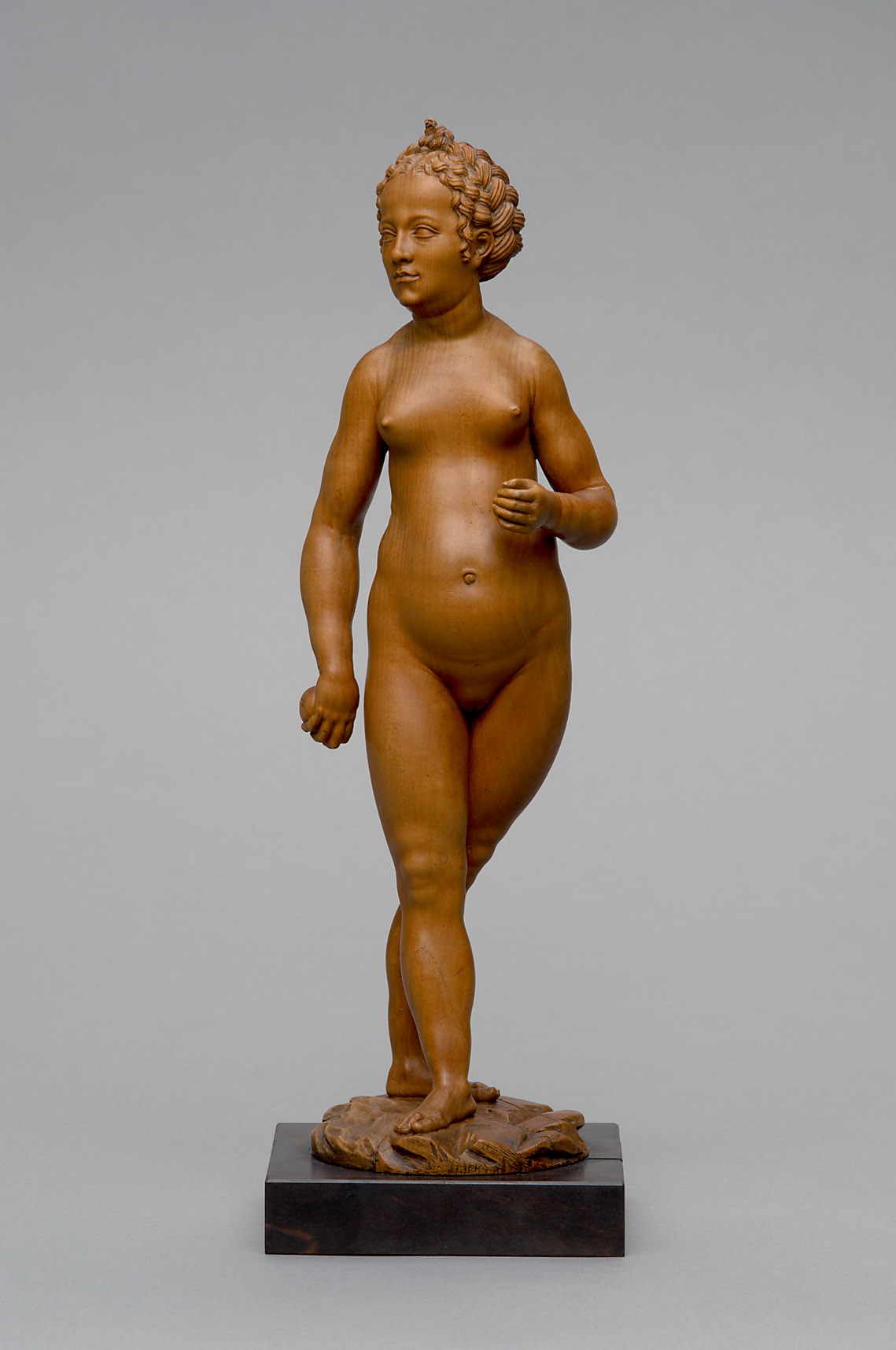 Eva hält in jeder Hand einen Apfel, Adam einen dritten in seiner rechten Hand. Das blasse Rot der Früchte ist erhalten, die Augen beider Figuren waren einst farbig gefasst. Spannung liegt in der Luft - entfaltet der Sündenfall bereits seine Wirkung?