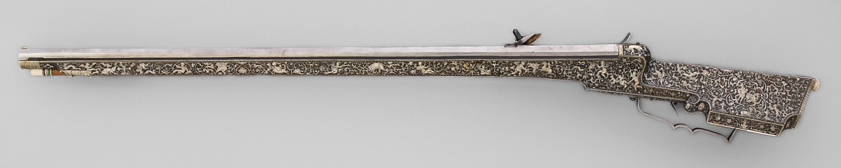 jedoch ohne Besitzerwappen.Die Oberfläche der Schäftung der Waffe ist vollständig mit kleinteiligem Ranken- und Bandgeflecht bedeckt. Darin tummelt sich eine Vielzahl allegorischer Figuren, Putten, Tier- und Fabelwesen. An der Unterseite des Vorderschaftes finden sich acht weibliche Figuren, von denen einige als Tugenden