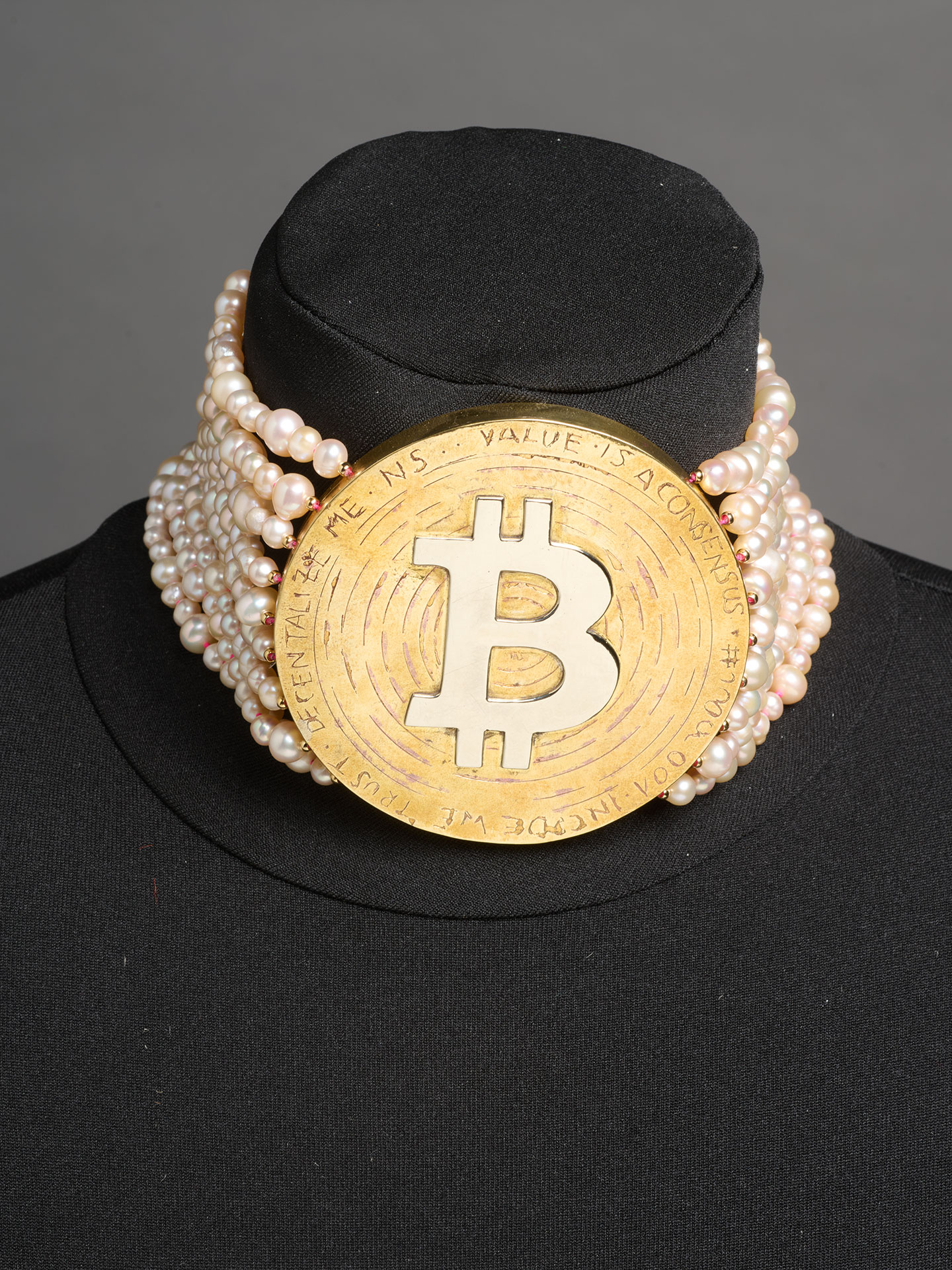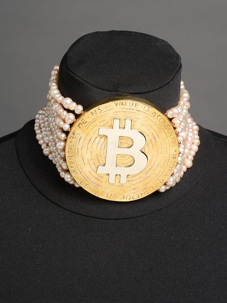 An oversized Bitcoin coin replaces the centrepiece of a classically inspired pearl necklace. The pearls represent the masses – anonymous, equal and decentralised. Bitcoin as a new currency symbolises the shift of power from the state to the networked community. But the necklace fits tightly around the neck, making it a burden to wear. The piece is a reflection on control and value and poses a critical question: does digital power liberate us – or does it just constrain us in a different way?