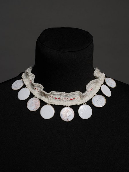 The collar, which usually fits around the neck, has been reimagined in this piece of jewellery and placed on the chest as a pendant on a pearl necklace. In contrast to traditional lace, the Lace Collar’ surprises with its unexpected weight, yet retains its lightness thanks to the detailed lace pattern.