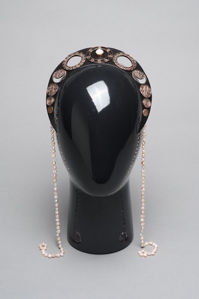 My wearable tiara is dedicated to Diana, the Roman goddess of the moon, and inspired by a medallion from 1551. The techniques and materials used are based on those of that era. A moonstone is set in the centre, filigree wires are shaped into sweeping elements, pearls and various phases of the moon adorn the piece – a diadem for a goddess (‘dea’ Latin for goddess).
