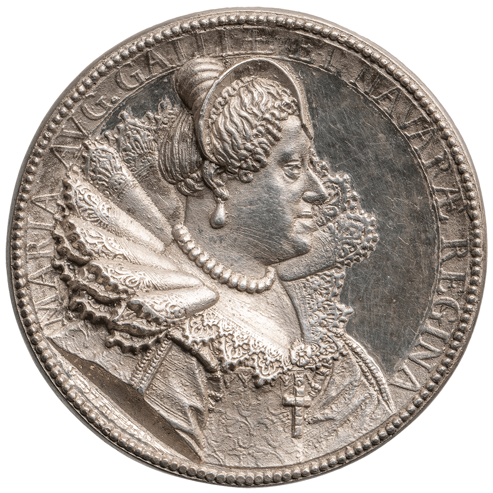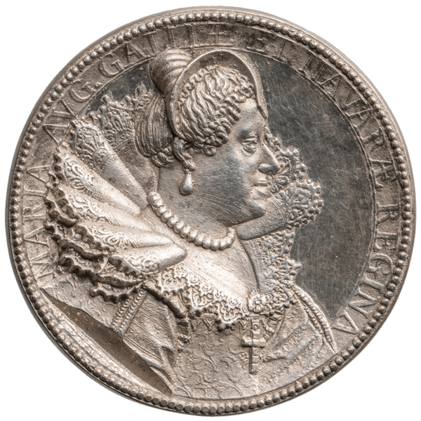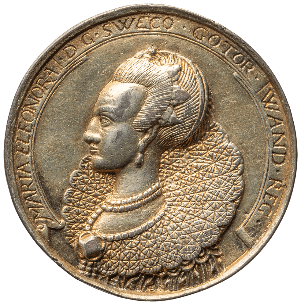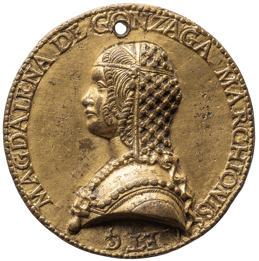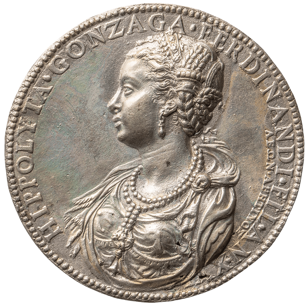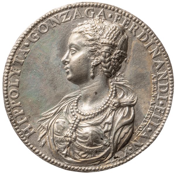 Based on a medal depicting Hippolyta Gonzaga Fernández in three-quarter profile, the head of a porcelain doll is cast in pewter using the sand casting process. The original inscription on the medal is stamped onto the outer frame of the pewter casting. The aim was to make the historical portrait three-dimensional.