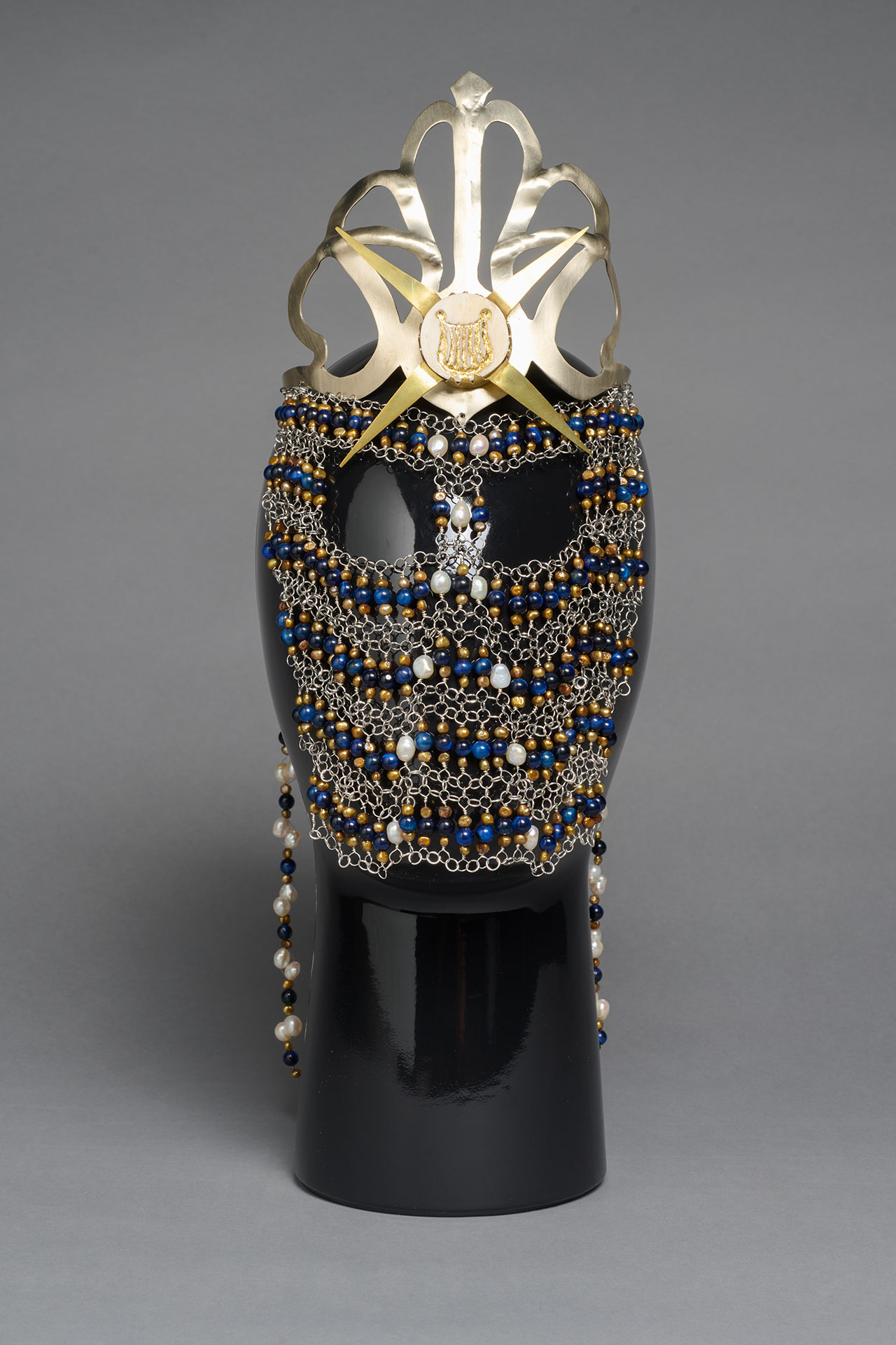 The pearl jewellery represents the inner spiritual core of human beings, which is carried through life in our minds. The hairnet emphasises the head as the bearer of this spirit. The veil separates our inner selves from the outside world – a symbolic barrier between thoughts and society.
