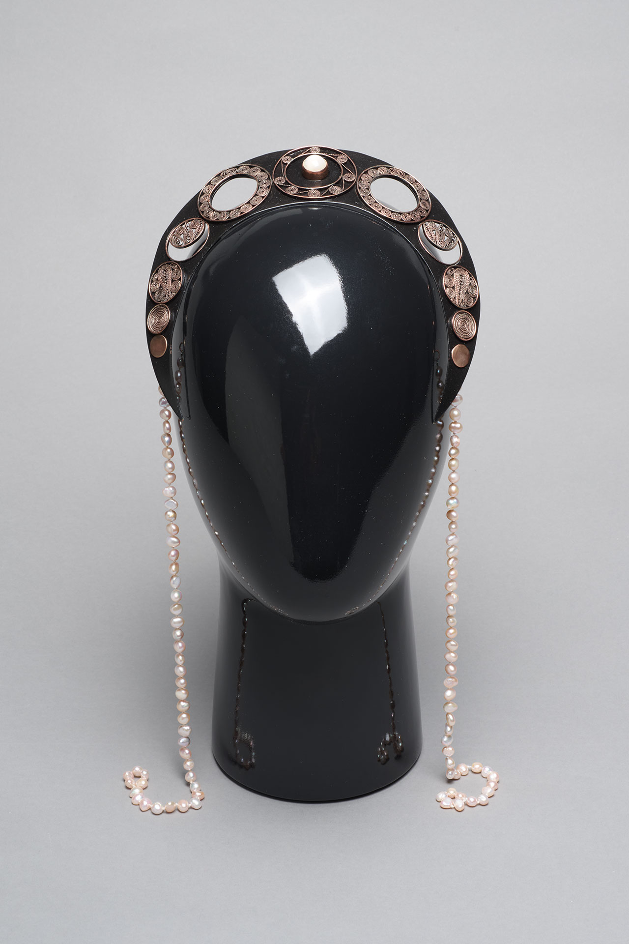 Lacquered copper, moonstones, pearls