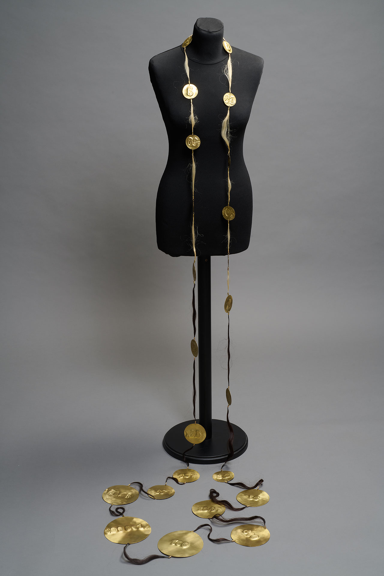 Embossed brass, human hair