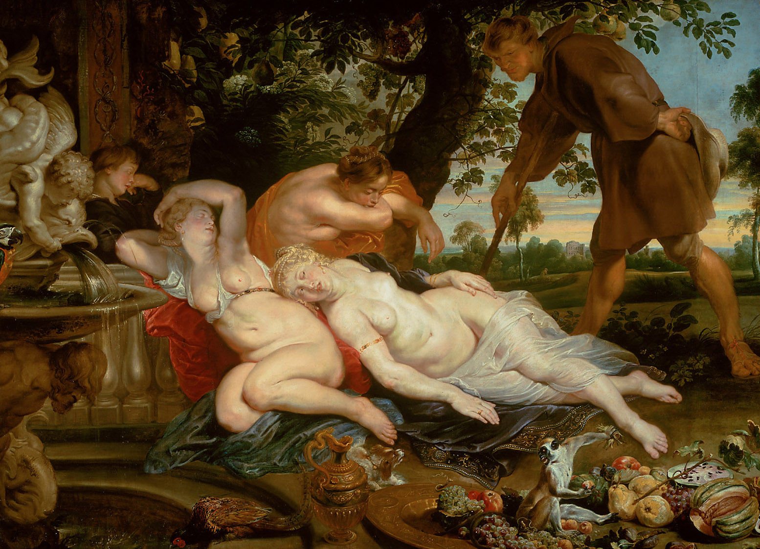 Boccaccios Novelle im Decamerone erzählt die Geschichte des trotz seiner hohen Abstammung an Bildung und guten Sitten desinteressierten Cimon. Beim Anblick der ebenso schönen wie gebildeten Efigenia beschloss er jedoch, sich ihre Liebe durch den Erwerb aller für einen Edelmann notwendigen Kenntnisse zu verdienen. Für das Früchtestillleben und die Landschaft zog Rubens, wie er dies öfters tat, die Maler Frans Snyders bzw. Jan Wildens heran.
