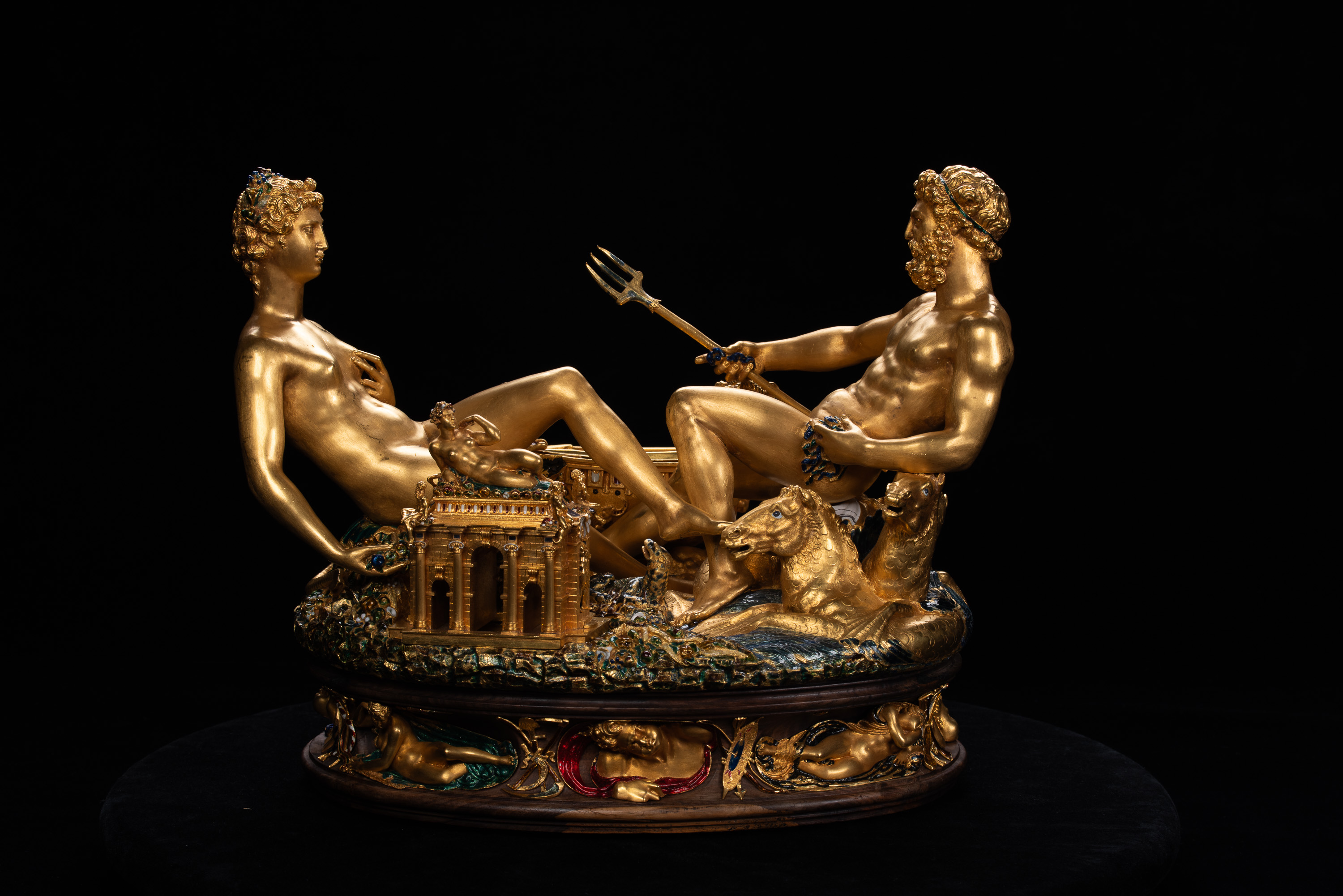 Die einzige erhaltene Goldschmiedearbeit des schon zu Lebzeiten berühmten Florentiner Künstlers ist weit mehr als ein kostbares Tischgerät für Salz und Pfeffer. Mit seinem Bildprogramm ist es ein Sinnbild des Kosmos, auf den die Gottheiten Neptun (Meer) und Tellus (Erde) ebenso verweisen wie die Motive der Tageszeiten und der vier Winde am Sockel. Diesen Kosmos beherrscht der in Wappen und Emblemen präsente Auftraggeber: König Franz I. von Frankreich.