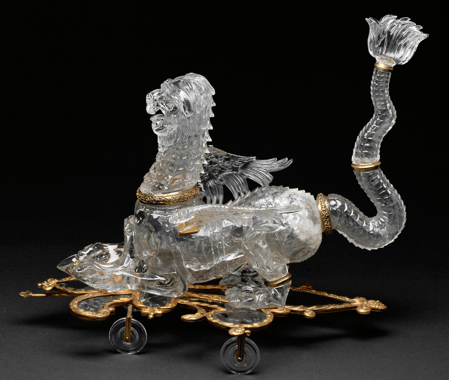 Der Löwendrache auf einer Standplatte mit vier Rädern ist aus mehreren ausgehöhlten Bergkristallteilen zusammengesetzt. Bei Tisch hatte er vermutlich die Funktion eines Wasserspiels. Betätigte ein unwissender Gast den Schuber an der Brust des Tieres, spritzte das im Bergkristall nicht sichtbare Wasser überraschend aus den drei dahinterliegenden Düsen hervor.