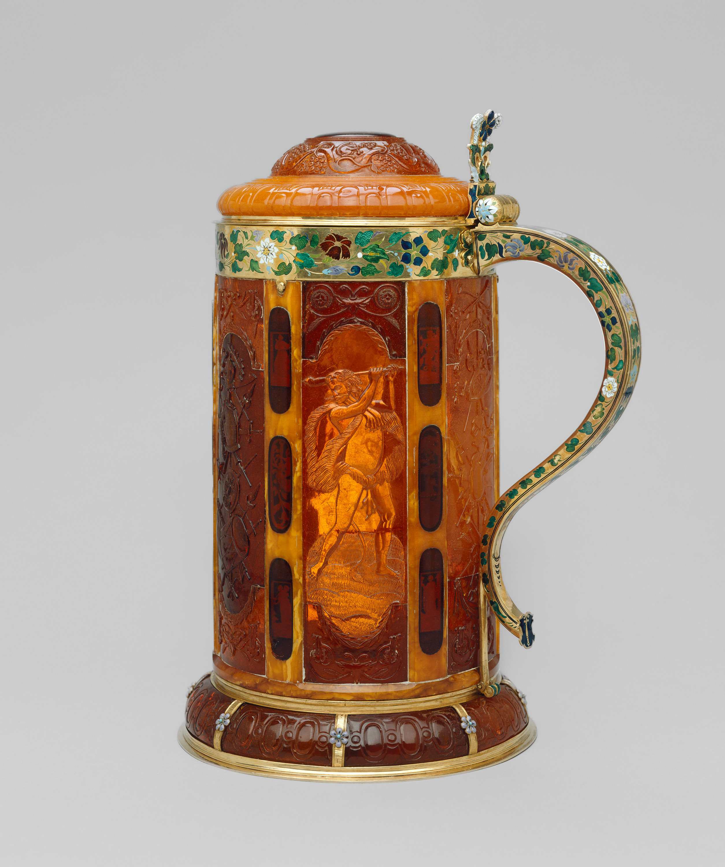 Hoher, schlanker Deckelhumpen, bunt emaillierte Goldfassung mit üppigem Blumendekor, die am Ende des Henkels das Kurszepter zeigt. Über dem gewölbten, godronnierten Fuß erhebt sich der zylindrische Gefäßkörper aus sechs hochrechteckigen Bernsteinfeldern, die alternierend mit Heldenfiguren und Trophäen reliefiert und oben und unten von Rankendekor gerahmt sind. Dazwischen sorgen vertikale Stäbe aus flumigem gelben Bernstein, in die jeweils drei hochovale Medaillons eingelegt sind, für die Stabilisierung des Gefäßkörpers und betonen gleichzeitig die Vertikale des tektonischen Gerüsts. Die miniaturhaft feinen Darstellungen unter den dunklen Bernsteinplatten nach Vorlagen des Nürnberger Kupferstechers Hieronymus Bang (1553-1630) zeigen neben Tierdarstellungen und floralen Motiven Allegorien der fünf Sinne sowie die vier Kardinaltugenden und drei theologische Tugenden. Am gewölbten Deckel prangt ein großes Medaillon mit dem preußischen Adler, wodurch das Prunkgefäß als kostbares Staatsgeschenk ausgewiesen wird. Innen am Boden zeigt ein Medaillon Bacchus beim Weingenuss in einer Landschaft, im Deckelinneren blickt der Betrachter einem lorbeerbekränzten Imperator in einem Medaillon ins Angesicht.