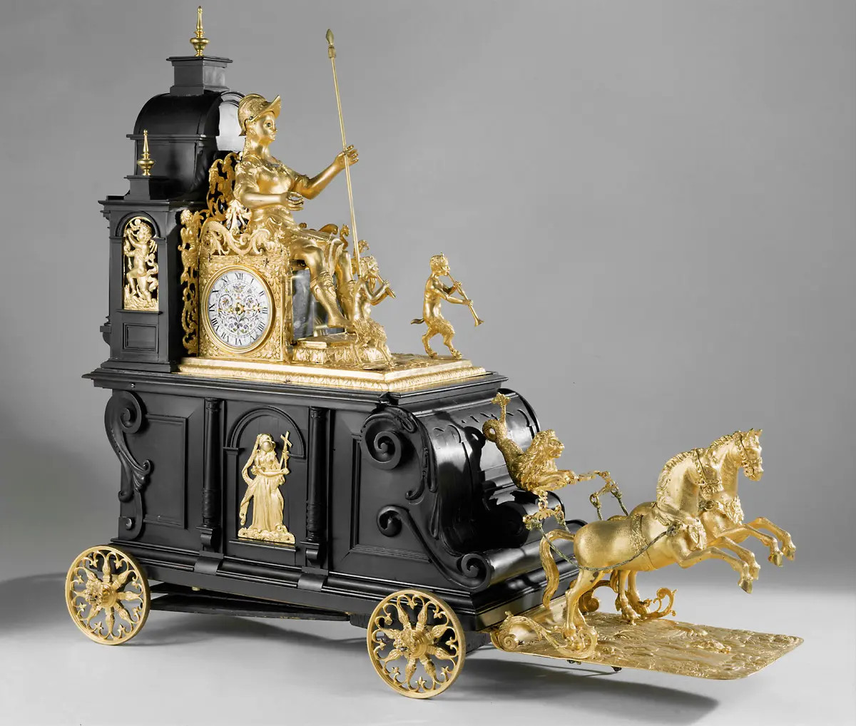 Kupferlegierung, vergoldet, Silber, Email, Ebenholz; Werk: Eisen; Orgelpfeifen: Zinn