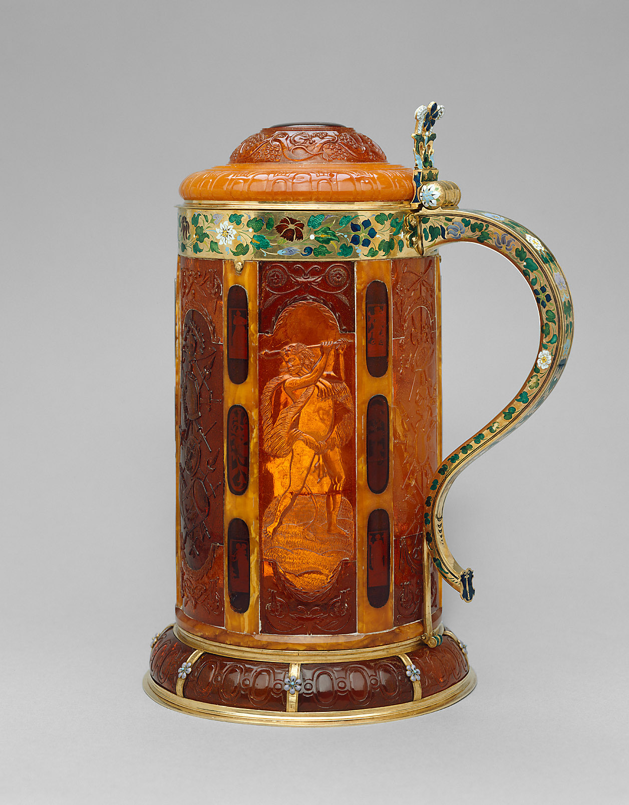 Hoher, schlanker Deckelhumpen, bunt emaillierte Goldfassung mit üppigem Blumendekor, die am Ende des Henkels das Kurszepter zeigt. Über dem gewölbten, godronnierten Fuß erhebt sich der zylindrische Gefäßkörper aus sechs hochrechteckigen Bernsteinfeldern, die alternierend mit Heldenfiguren und Trophäen reliefiert und oben und unten von Rankendekor gerahmt sind. Dazwischen sorgen vertikale Stäbe aus flumigem gelben Bernstein, in die jeweils drei hochovale Medaillons eingelegt sind, für die Stabilisierung des Gefäßkörpers und betonen gleichzeitig die Vertikale des tektonischen Gerüsts. Die miniaturhaft feinen Darstellungen unter den dunklen Bernsteinplatten nach Vorlagen des Nürnberger Kupferstechers Hieronymus Bang (1553-1630) zeigen neben Tierdarstellungen und floralen Motiven Allegorien der fünf Sinne sowie die vier Kardinaltugenden und drei theologische Tugenden. Am gewölbten Deckel prangt ein großes Medaillon mit dem preußischen Adler, wodurch das Prunkgefäß als kostbares Staatsgeschenk ausgewiesen wird. Innen am Boden zeigt ein Medaillon Bacchus beim Weingenuss in einer Landschaft, im Deckelinneren blickt der Betrachter einem lorbeerbekränzten Imperator in einem Medaillon ins Angesicht.