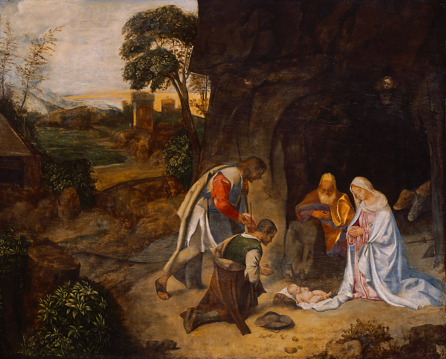 Eine abendliche Stimmung voll Frieden und pastoralem Zauber bettet das Wunder der Menschwerdung Christi in die Natur. Ihre poetische Schilderung nimmt den größten Teil des Gemäldes ein. Ehrfurcht und Demut eint Hirten und Eltern, in deren Mitte am Boden liegend, schutzlos und nackt, Christus sein Erdenleben beginnt. Das Bild ist eine unvollendet gebliebene Wiederholung der als eigenhändiges Frühwerk Giorgiones geltenden „Anbetung“ in Washington.